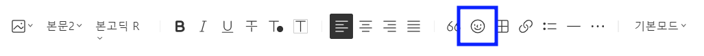 티스토리 블로그에 카카오톡 캐릭터 스티커를 사용하는 방법은 매우 간단합니다. 글쓰기 모드로 들어가면 상단에 얼굴 모양을 확인할 수 있습니다. 이 얼굴 모양 아이콘을 클릭하면 다양한 이모티콘 스티커를 선택할 수 있습니다.