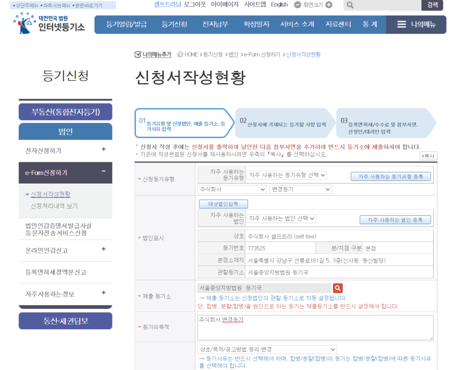 상호, 목적, 공고방법 등의 변경등기는 회사의 영업소 소재지를 관할하는 지방법원, 그 지원 또는 등기소에 신청하며, 본점 관할 이외에 지점을 설치하여 지점등기부가 개설되어 있는 때에는 지점관할 등기소에도 그 변경등기를 신청하여야 합니다. 상호나 목적 또는 공고방법을 변경한 경우 주주총회 결의일로부터 본점소재지에서는 2주 이내, 지점소재지에서는 3주 이내에 대표이사 또는 그 대리인이 변경등기를 신청하여야 합니다. 다만 변호사 또는 법무사가 아닌 사람은 신청서의 작성이나 그 서류의 제출 대행을 업(業)으로 할 수 없습니다.