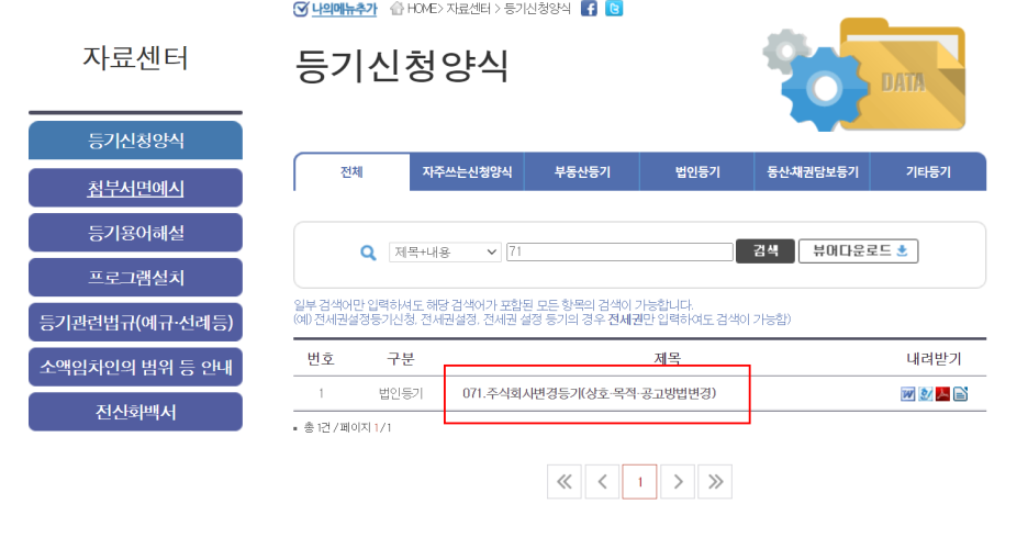 3. 등기신청양식 중 071. 주식회사 변경등기(상호 - 목적 - 공고방법변경)을 클릭합니다.