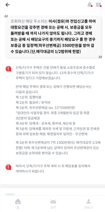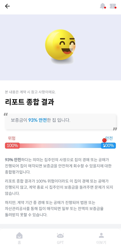전 이 집은 가계약하기 전에 돌려봤었는데 안전이 나와서 계약했습니다. 그전에 봤던 집은 위험 100%가 나온 거예요;; 다행히 위험 100%가 나왔을 때 조심해야 하는 부분과 어떻게 해야 하는지 상담사분이 친절하게 설명해 주셔서 피할 수 있었어요. 잘못했으면 내가 2년 뒤 뉴스 나와서 울고 있었을지도....